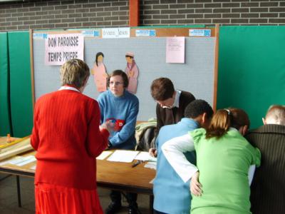 A côté,un groupe de jeunes qui cherchent une priére avec des mots à reconstituer.
