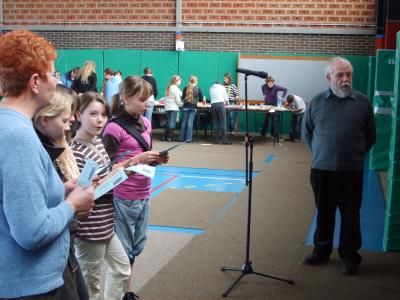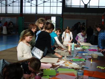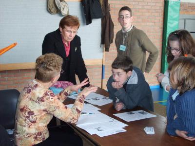 Valérie et Marie-thérése sont au stand : "quizz " où elles expliquent le jeu. Les enfants doivent répondre à 10 questions dont ils trouveront les réponses sur les différents panneaux disposés dans la salle de sports à Oignies.