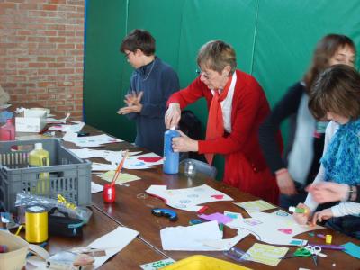 Maudette entourée d'un groupe de jeunes au stand : "chemises" où les enfants décorent leur chemise en carton.