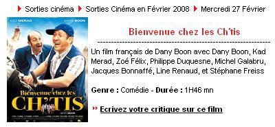 Séances de cinéma pour le film : Bienvenue chez les Ch'tis Vendredi 29 février à 20h30 Samedi 1er mars et Dimanche 2 mars à 14h15,16h30,18h45 et 21h Lundi 3 mars à 20h Futur programme jusqu'au 25 mars pour ce film en alternance avec d'autres films dont les horaires ne sont pas encore prévus. Tarif tout public : 4,80 € Prévoir d'être sur place 1h30 avant chaque séance. Avis à tous ceux qui aiment le cinéma comique.