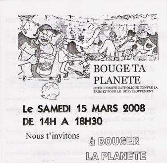 " Le samedi 15 mars 2008 de 14h à 18h30 : Nous t'invitons à BOUGER LA PLANETE ". Si c'est un événement pour les jeunes, c'est aussi un événement qui rassemble des jeunes et des adultes de notre paroisse: il ne concerne pas seulement les catéchistes et les animateurs, les parents, l'EAP mais aussi tous les paroissiens qui voudraient s'impliquer dans cette action.