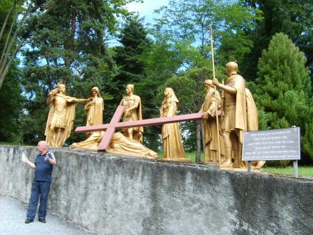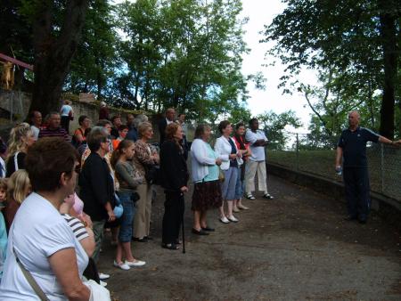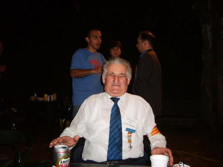 " Nous vous présentons l'animateur qui porte la pancarte du pélerin d'un jour d'Aix-en Provence avec qui nous avons fais la procession aux flambeaux et où il nous a demandé de l'accompagner jusqu'au foyer des brancardiers dont il est membre de l'Hospitalité depuis plusieurs années pour nous offrir le verre de l'amitié " .