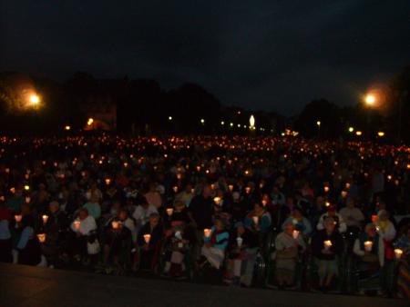 " La procession aux flambeaux le soir où nous voyons la lumière des flambeaux avec le chant de l'Ave Maria écrit en plusieurs langues " .